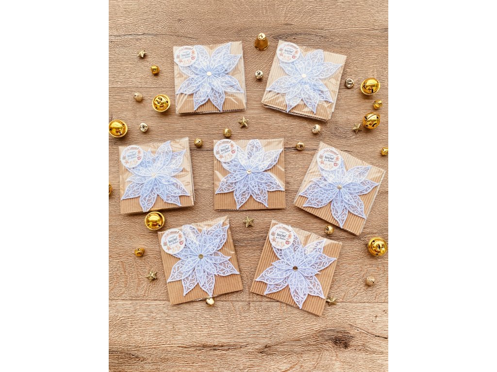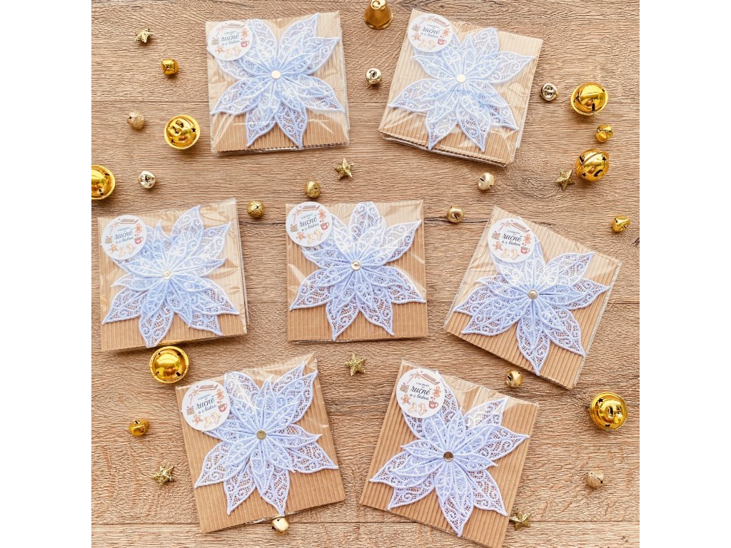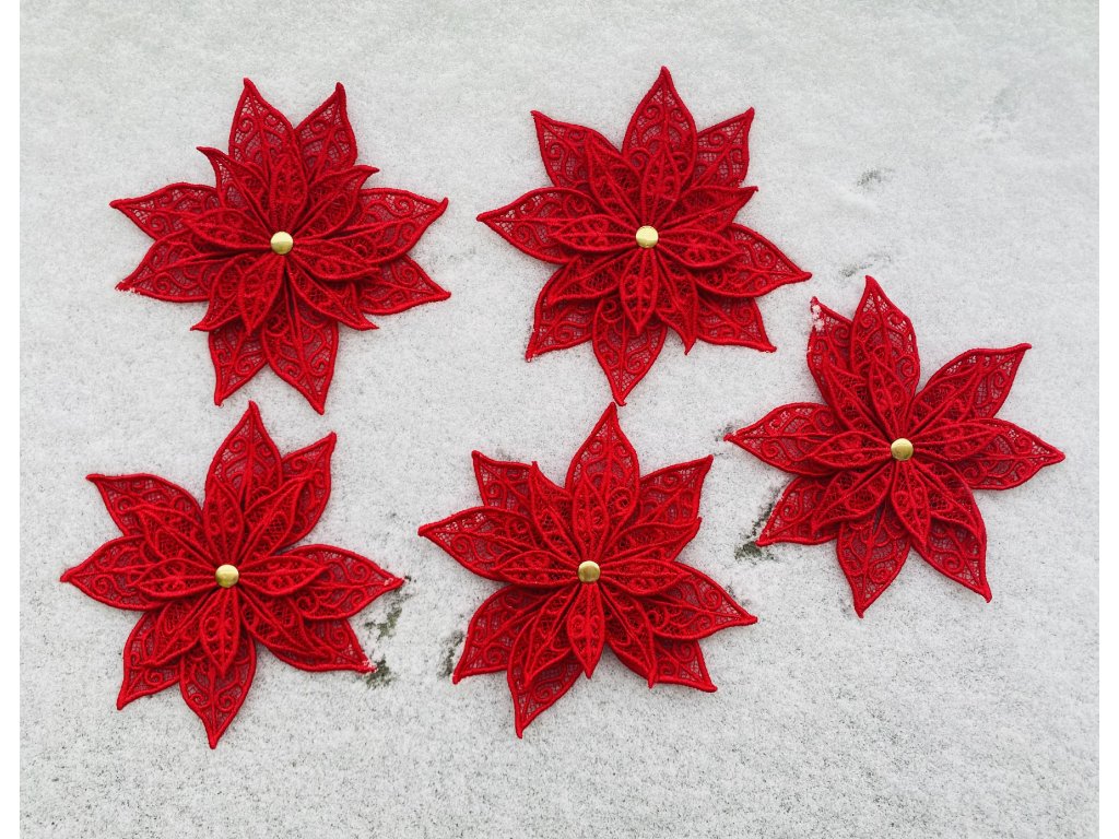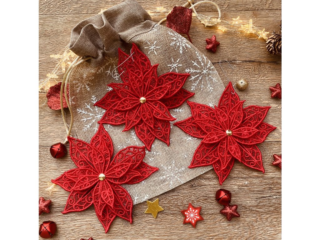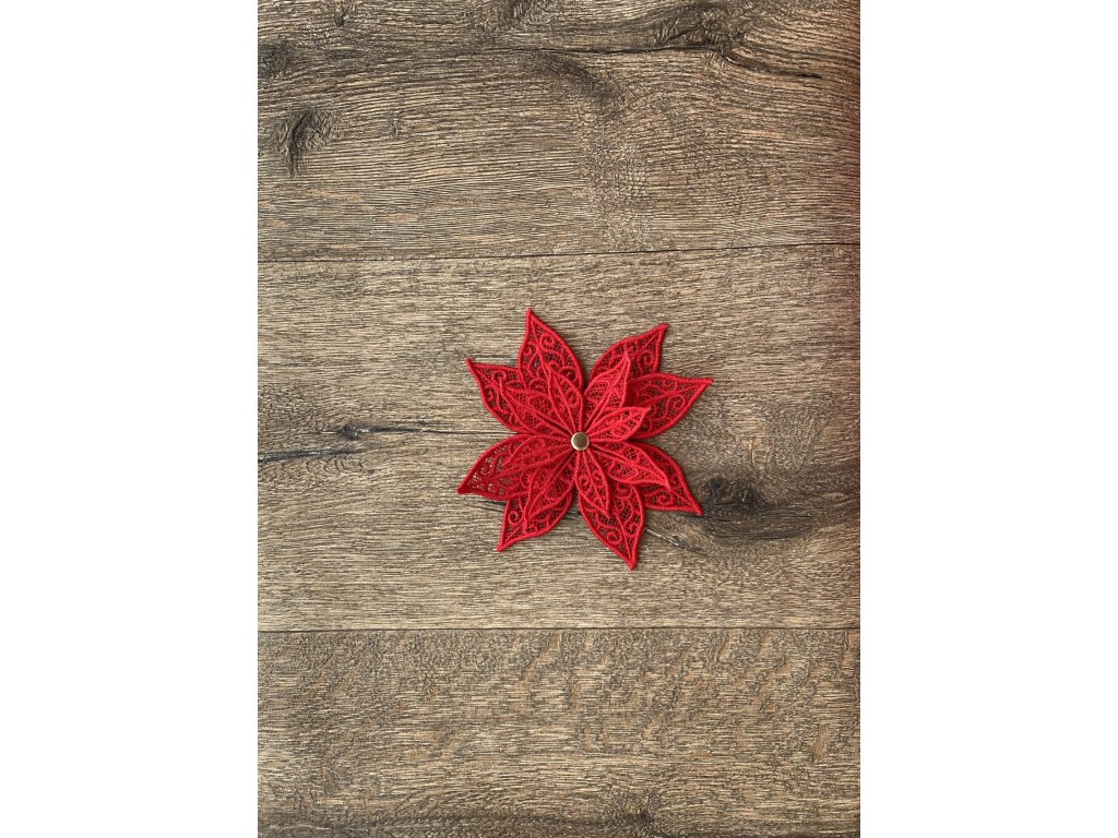 Vytvořte si kouzelnou vánoční atmosféru s elegantní vánoční 3D krajkovou hvězdou z precizně vyšívané krajky. Tato ozdoba o velikosti 12 cm je sestavená ze čtyř samostatných vyšívaných částí, které po spojení vytvářejí nádherný prostorový 3D efekt.Červená krajka působí bohatým, slavnostním dojmem a její detailní vzor připomíná vánoční květ vánoční hvězdu (poinsettia). Zlatý korálek uprostřed dodává dekoraci luxusní vzhled.Na fotce jsou vidět výrazná červená hvězda s jemnou krajkovou výšivkou, které vyniknou na vánočním stromečku, větvičce, věnci i v zimních dekoracích. Nebo jako luxusní dárek